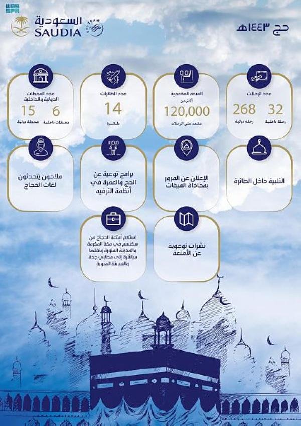 خصصت الخطوط الجوية السعودية أسطولاً خاصاً يبلغ (14) طائرة لخدمة رحلات الحج التي تبلغ (268) رحلة دولية في (15) محطة، و(32) رحلة داخلية في (6) محطات، وسيُوَفَّر من خلالها أكثر من (107) آلاف مقعد على القطاع الدولي، و(12,8) ألف مقعد على القطاع الداخلي، بالإضافة إلى الرحلات المجدولة والإضافية التي تصل إلى حوالي (100) وجهة داخلية ودولية. وكشفت الخطوط الجوية السعودية عن خطتها التشغيلية لنقل ضيوف الرحمن (حجاج بيت الله الحرام) في مرحلة القدوم من جميع أنحاء العالم إلى مطارَيَ الملك عبدالعزيز الدولي بجدة والأمير محمد بن عبدالعزيز الدولي بالمدينة المنورة، بالإضافة إلى مرحلة المغادرة، حيث اعتُمِد توفير الرحلات والسعة المقعدية التي تناسب المتطلبات التشغيلية وحجم الطلب، بالإضافة إلى تقديم أفضل الخدمات في جميع مراحل السفر ومواقع الخدمة كافة.