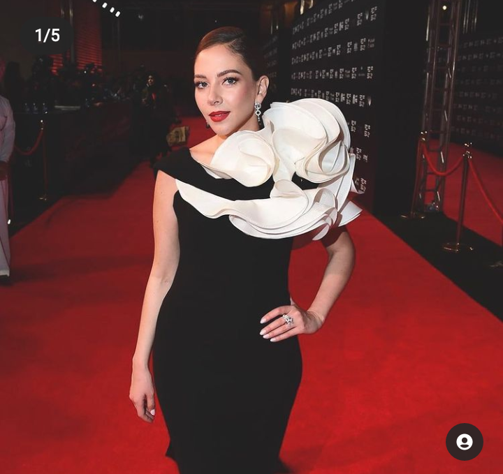 تألقت فاطمة البنوي بفُستان من تصميم روان كتوعه، على السجادة الحمراء بمهرجان البحر الأحمر السينمائي الدولي، الفُستان يكسوه اللون الأسود وقطعة من التول المُطرز بالأسود مُنسدلة من الظهر بطول يجعلها كالملكة، وزين الفُستان وردة كبيرة كل كتفها باللون الأبيض في تصميم مُختلف ومُميز.