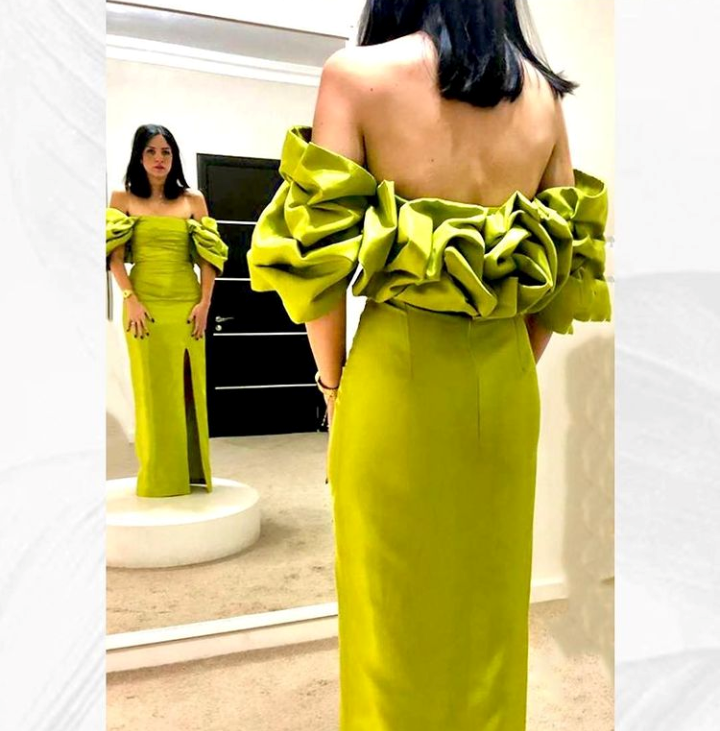 قامت مُدونة الموضة ومُصممة الأزياء شاهندة حجازي، بنشر إطلالات مُختلفة لها بأزياء السهرة، التي تميزت بألوان راقية وتصميمات تختلف عن غيرها حيث اعتمدت على كشاكش منفوخة على الأكتاف والظهر وأيضاً على الصدر، كما هو موضح في الفُستان التالي الذي اختارته باللونLime green .
