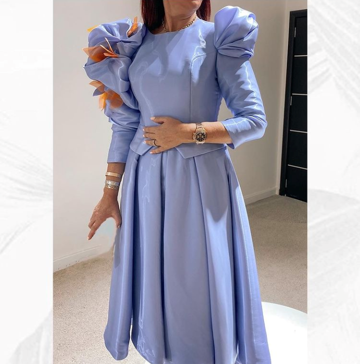 ويُعد الفُستان البيبي بلو الساتان تصميماً مُختلفاً، يعكس رُقياً وأناقة حيث تميز بوجود أكتاف عليها كشاكش منفوخة لزيادة عرض الكتفين، وتم تزيين أحد الكتفين بورود بُرتقالي في طيات الكشاكش، مع انسدال الفُستان بكسرات البليسيه الواسع في تصميم فريد يبدو عليه جهد صانعه.
