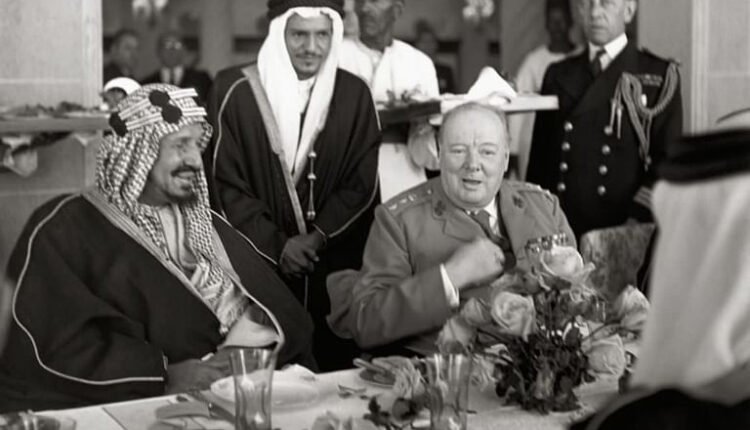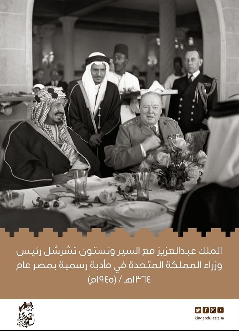 نشر حساب الملك عبدالعزيز الرسمي على منصة التواصل الاجتماعي “تويتر”، صورة تاريخية يعود عمرها إلى 77 عامًا، وتجمع “المؤسس” برئيس وزراء بريطانيا “ونستون تشرشل”، وذلك في مأدبة رسمية بمصر عام 1364هـ، 1945م.