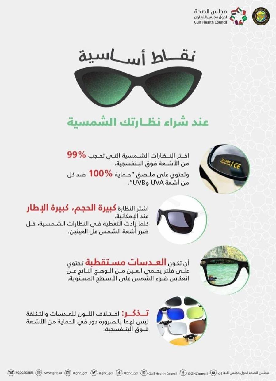 وأضاف مجلس الصحة الخليجي فيما يخص النظارات الشمسية أن هناك نقاطاً أساسية لابد الأخذ بها عند الشراء، وأهمها اختيار التي تحجب 99% من الأشعة فوق البنفسجية، وتحتوي على ملصق يفيد بحمايتها بنسبة 100% ضد كل من أشعة UVA وUVB.